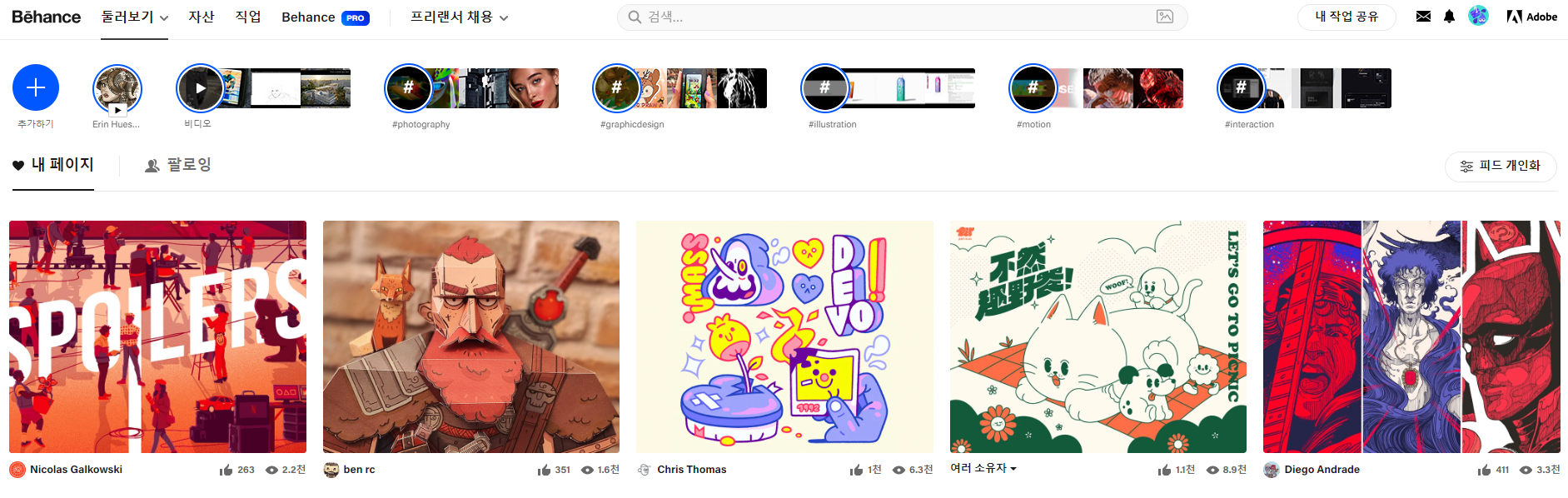 - 전 세계 디자이너들이 자신만의 포트폴리오를 자랑하는 곳! 그래픽 디자인, 일러스트, UI/UX 등등... !다 모여 있어요.
