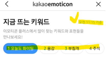 카카오톡 이모티콘 샵에서는 매일~매시간마다 '지금 뜨는 키워드'를 업데이트합니다.