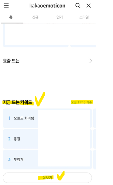 이모티콘샵에 들어가면 바로 [지금뜨는 키워드]-[더보기]를 통해 [업데이트 된시간]을 기준으로