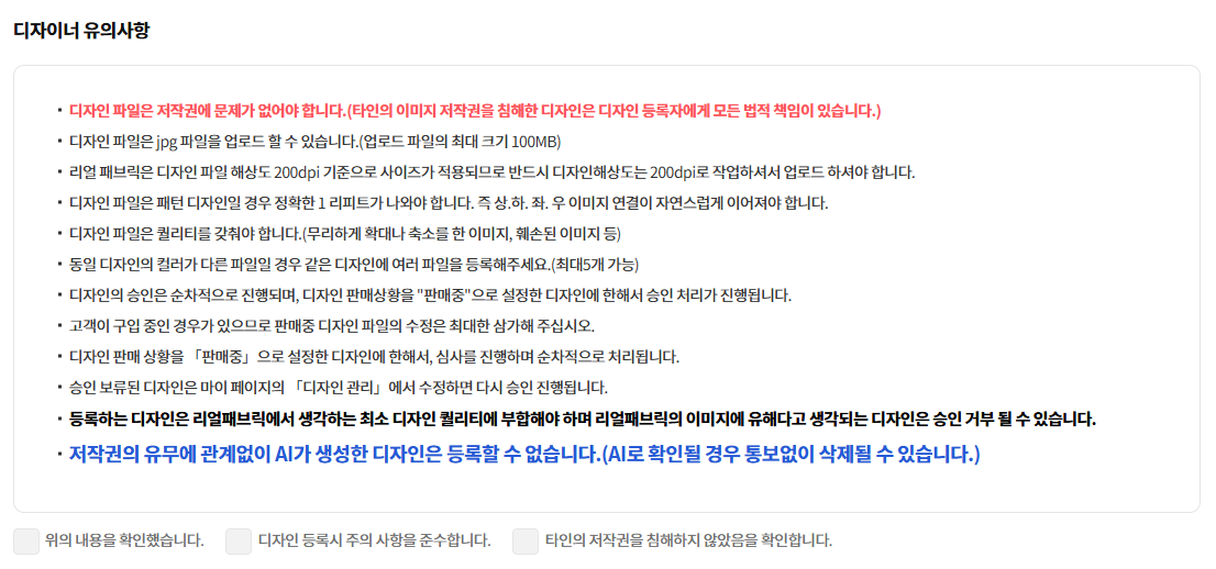 리얼패브릭에서 자체적으로 심사를 거쳐 등록 되며, - 디자인 등록 주의사항이 있습니다.(아래 따로 적어둘게요!)