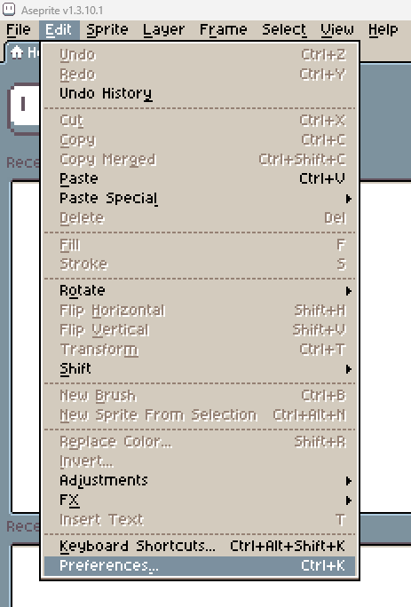 Aseprite에 처음 들어가게 되면 왼쪽 상단에 메뉴바가있습니다.