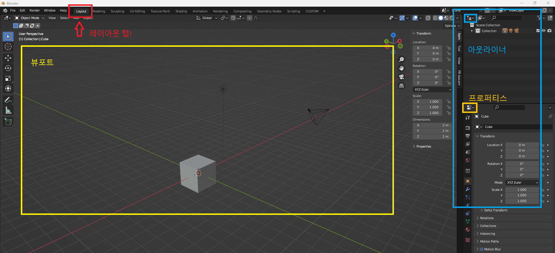 블렌더를 처음 실행하면 다소 복잡하게 느껴질 수 있지만,