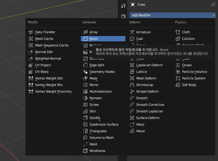 - 오브젝트의 모서리(엣지)나 꼭짓점(버텍스)에 경사면을 추가하여 날카로운 모서리를 부드럽게 만드는 기능.