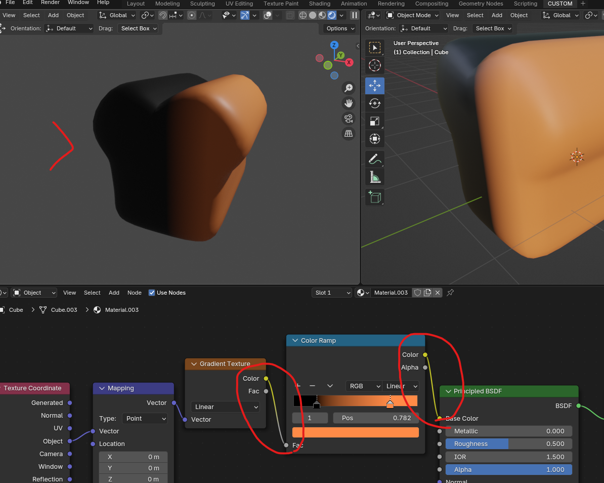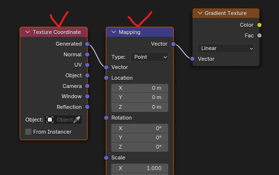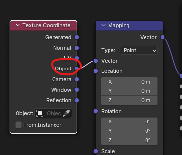 - Texture Coordinate의 Object를 Mapping 노드에 연결하여 객체 기반 그라데이션을 적용.