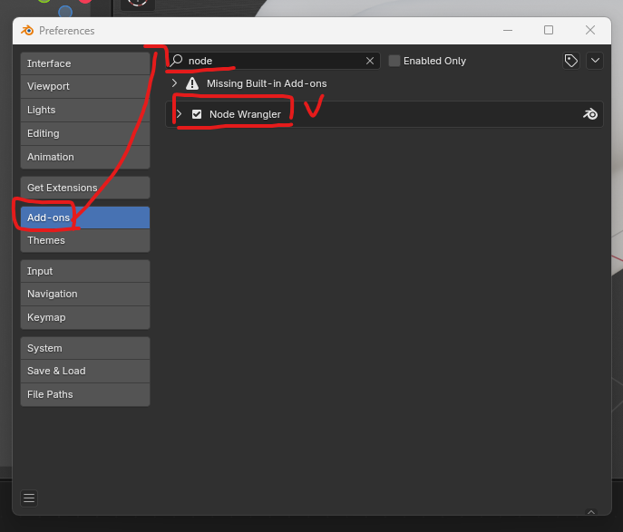 2. "Node Wrangler" 검색 후 체크(✔)하여 활성화 합니다.