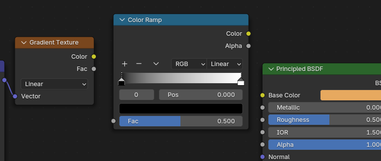 - Shift + AConverterColorRamp 추가 후 Gradient Texture의 Color에 연결.