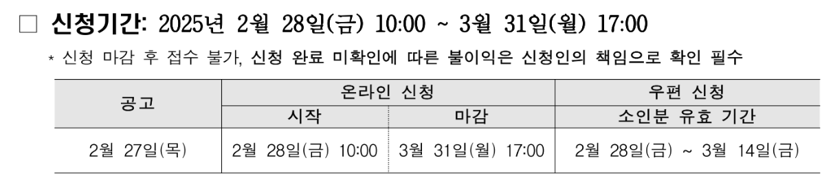 - 신청기간: 2025년 2월 28일(금) 10:00 ~ 3월 31일(월) 17:00