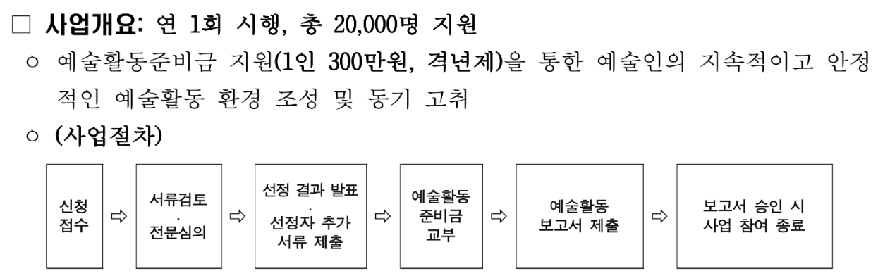 • 지원대상: 예술창작활동을 준비 중인 현업 예술인(원로 및 장애예술인 포함)