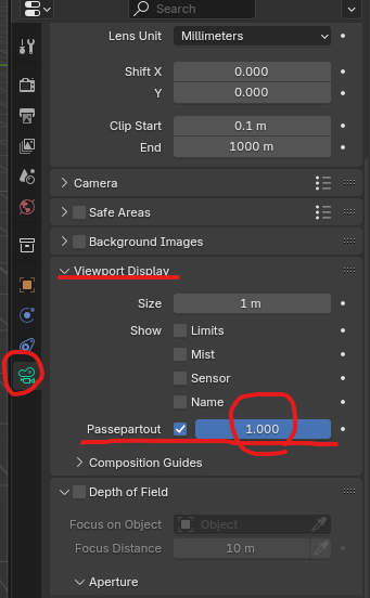 • Passepartout 값1.0으로 변경하면 카메라 프레임 외부가 완전히 검정색으로 표시됩니다.