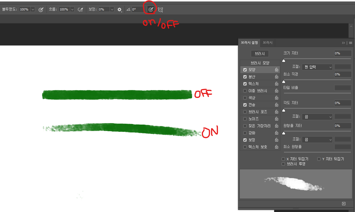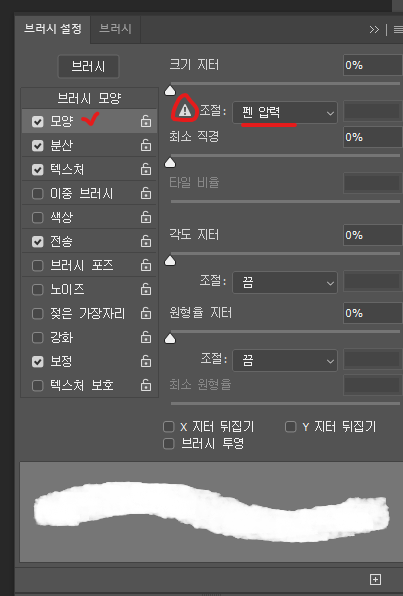 - 다시 브러시 써보면...느낌표가 사라지고 필압이 작동합니다!!!