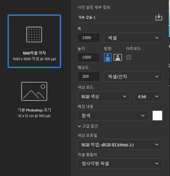 - 새 파일 만들기 → 크기를 1000픽셀 이상으로 설정